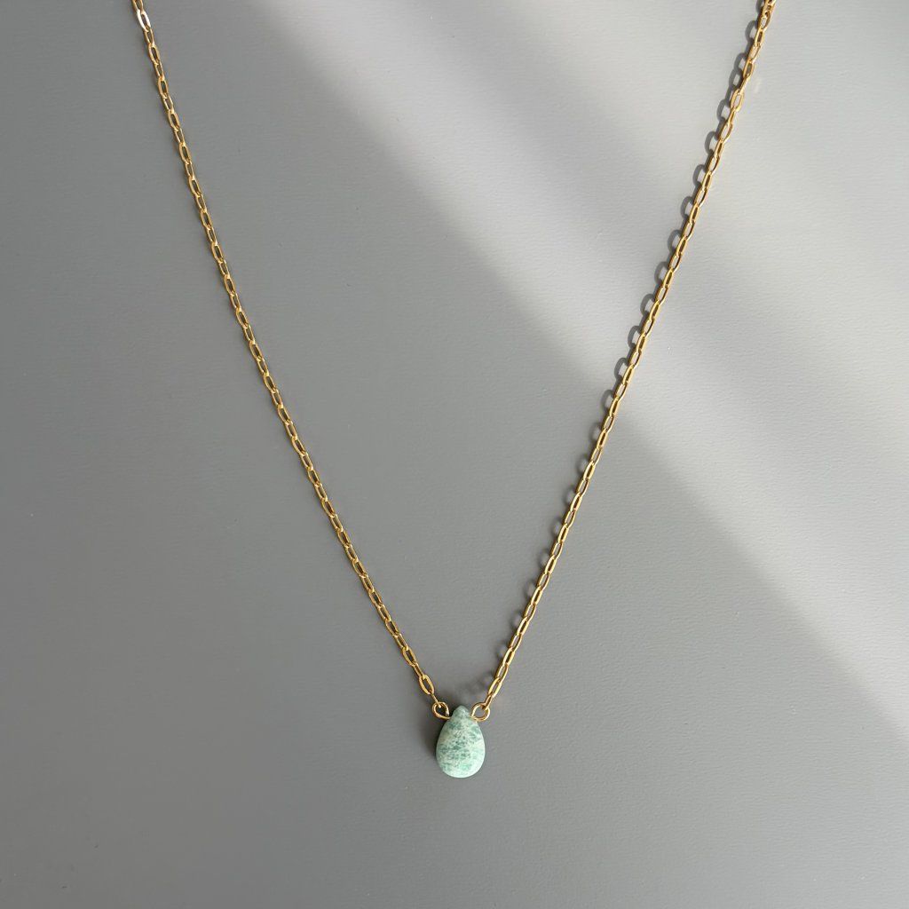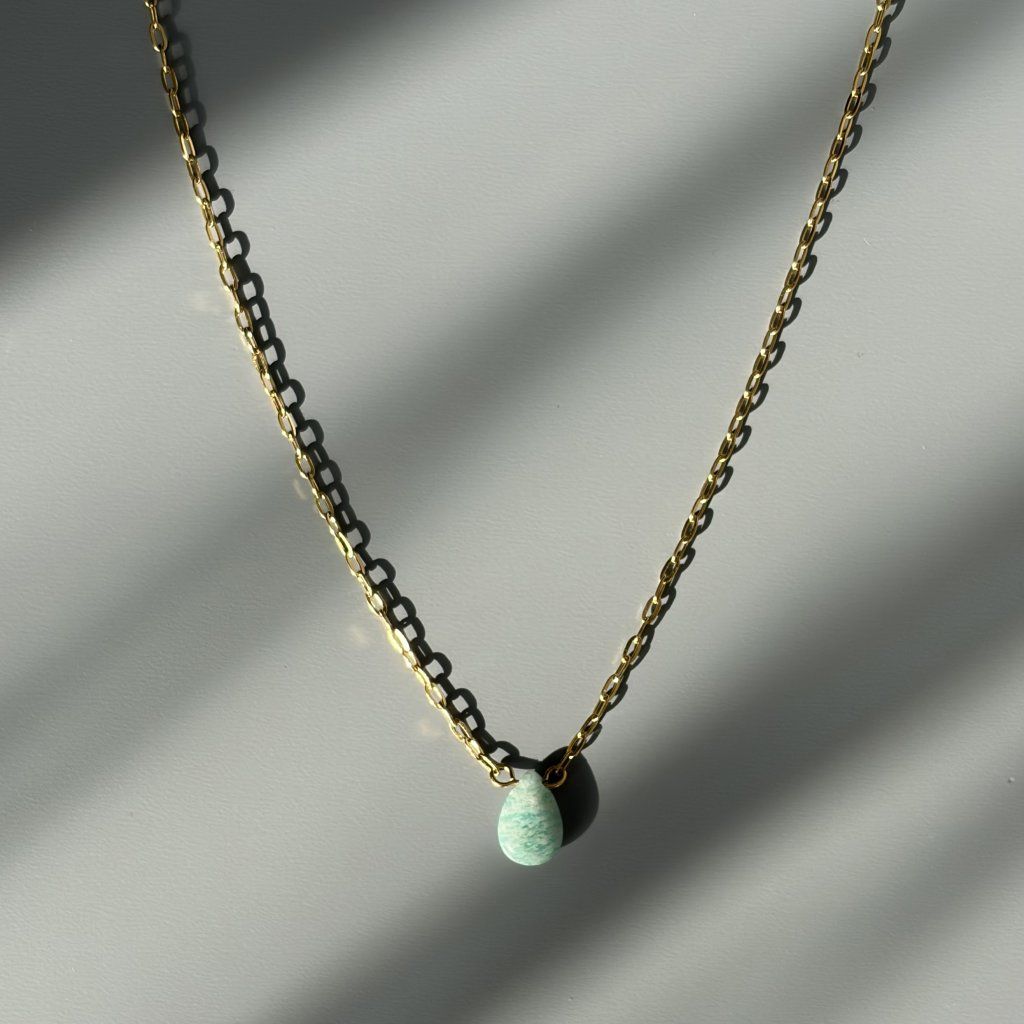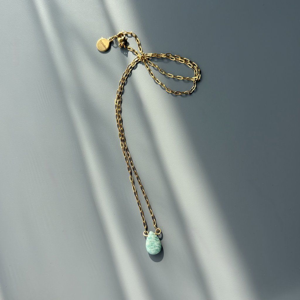 Dopřej si radost s tímto minimalistickým náhrdelníkem na jemném paper clip řetízku s detailem kapky přírodního amazonitu.