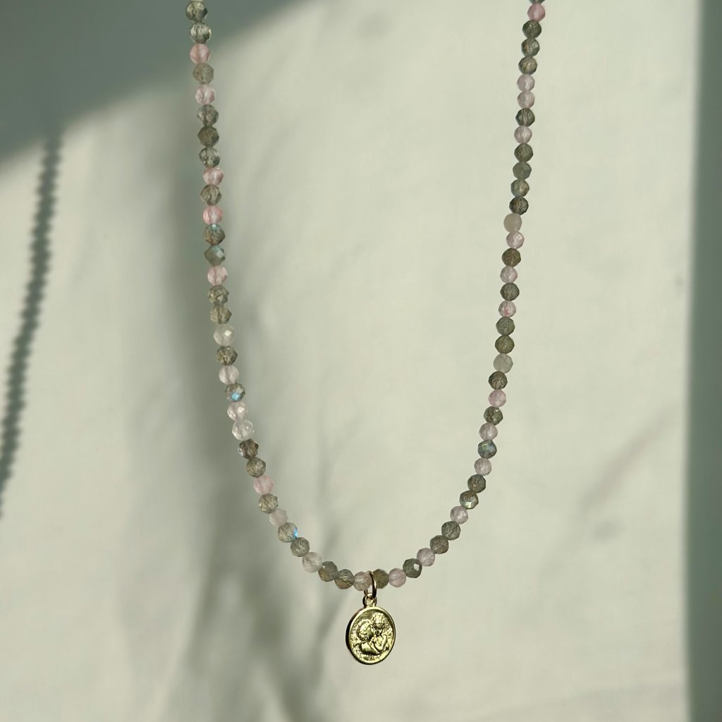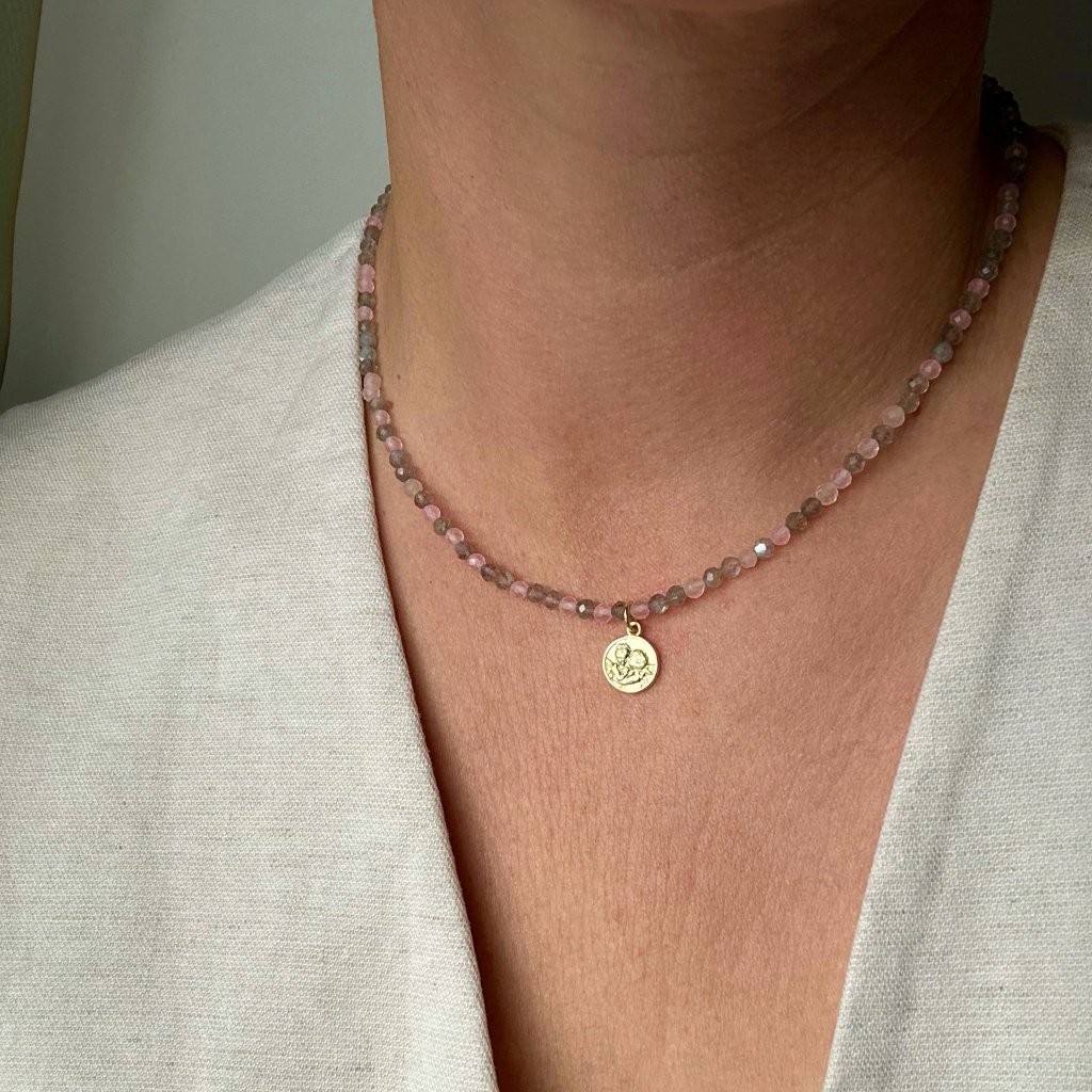 Náhrdelník pro štěstí z polodrahokamů s medailonkem s andílky.