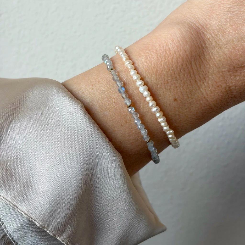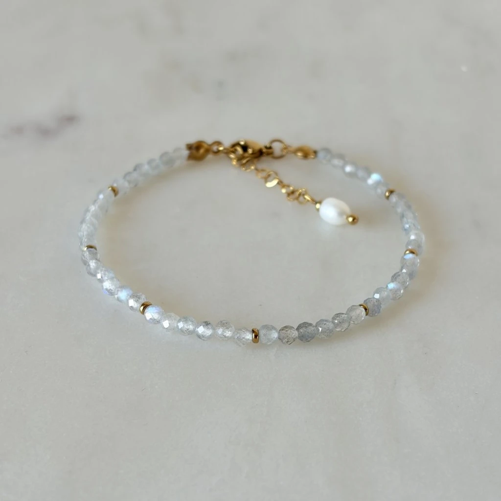 Jemný náramek, který v sobě nese ticho přírody a nenápadnou eleganci. Drobné korálky labradoritu okouzlí svými proměnlivými odlesky, při každém pohybu zachytí světlo a rozehrají jemnou hru barev, která působí tajemně a zároveň uklidňujícím dojmem.