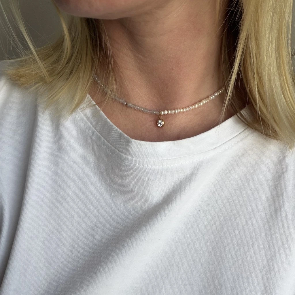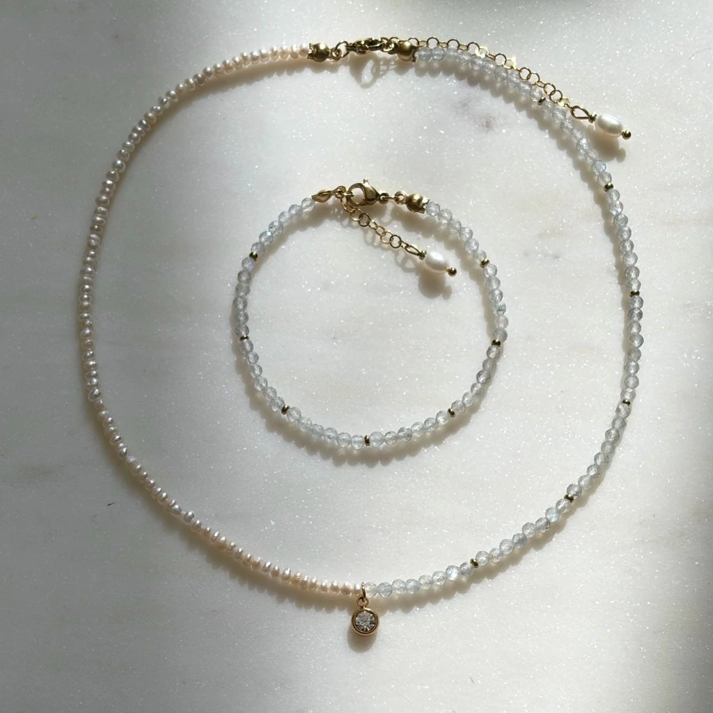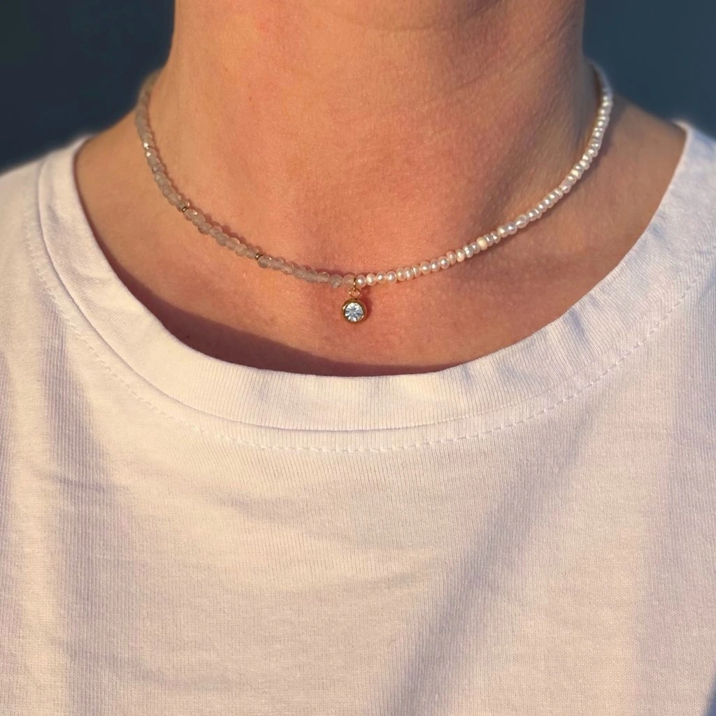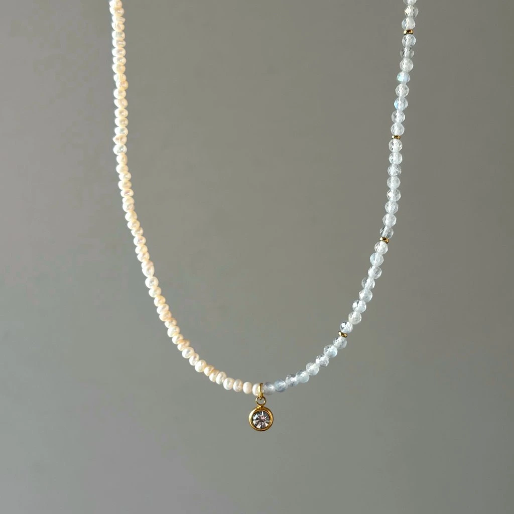 Perly symbolizují čistotu a ženskost, zatímco labradorit okouzlí svými proměnlivými odlesky, které se jemně mění s každým pohybem. Celý šperk je doplněn subtilním přívěskem se zirkonem, který dodává náhrdelníku lehký třpyt a podtrhuje jeho elegantní charakter.