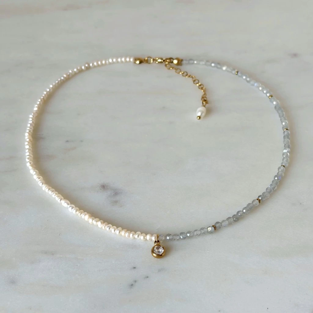 Minimalistický náhrdelník s labradoritem a perlami doplněný jemným zirkonem.