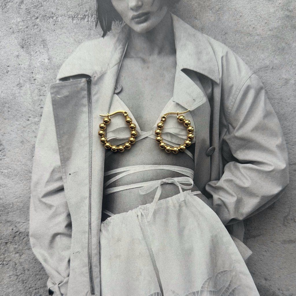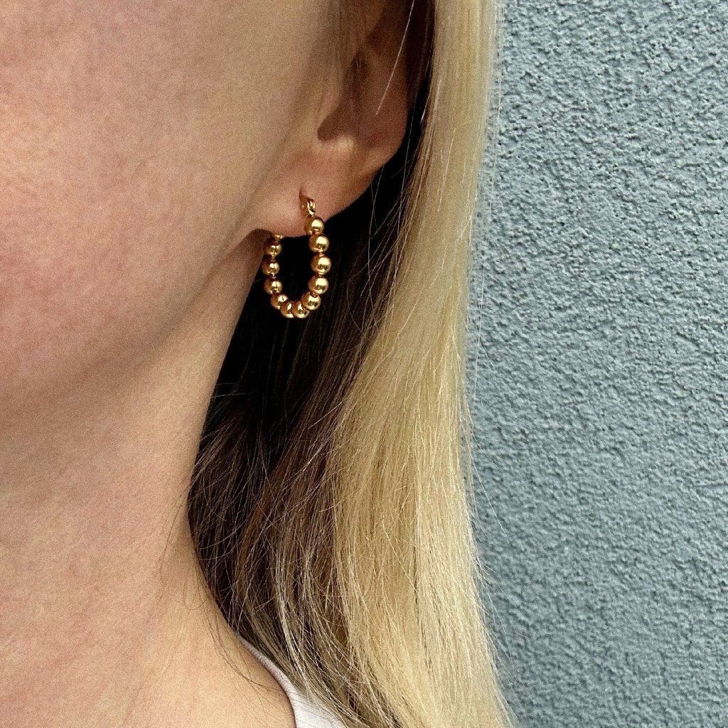 Tyto kruhové náušnice s bublinkami představují nadčasový a elegantní šperk, který se snadno kombinuje s každým outfitem. Jemný kuličkový design dodává náušnicím moderní vzhled, zatímco kruhový tvar působí klasicky a žensky. Náušnice jsou lehké, pohodlné a vhodné pro celodenní nošení.