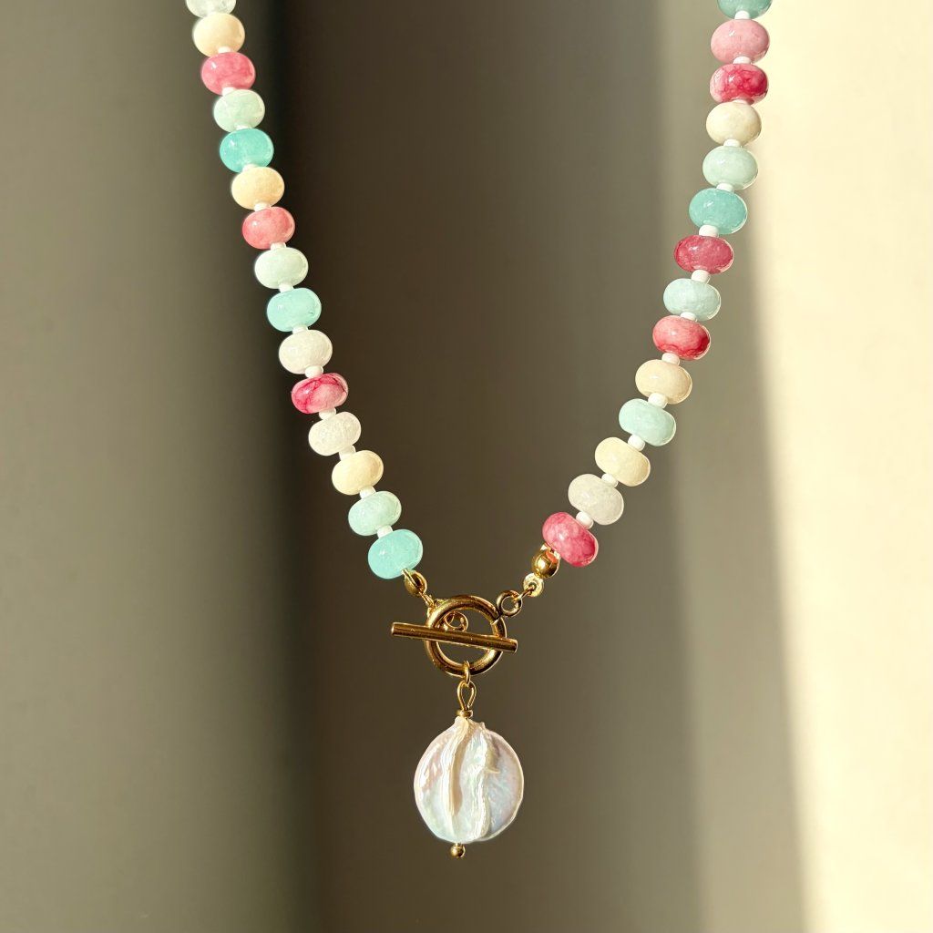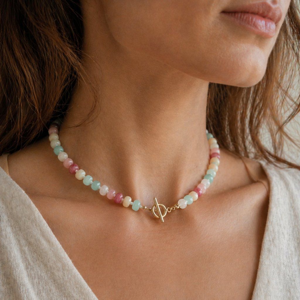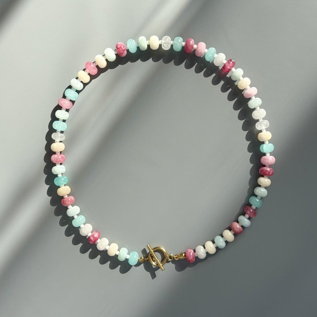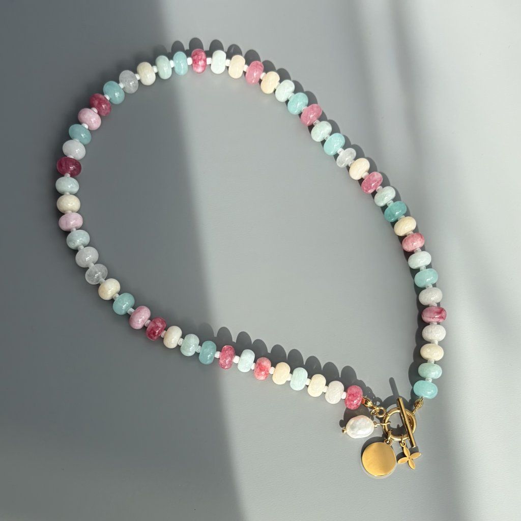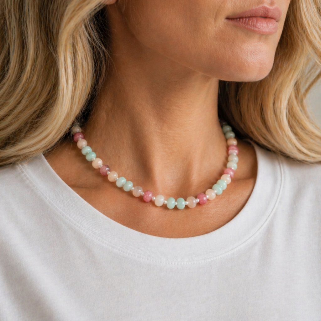 Tento náhrdelník je přesně ten detail, který promění jednoduchý look v něco výjimečného. Kombinace jemně broušených korálků Morganitu (5 × 8 mm) v pastelových tónech růžové, mentolové, tyrkysové a krémové působí svěže, žensky a naprosto trendy. Morganit je proložen drobnými perleťovými detaily, které dodávají šperku lehký třpyt a luxusní nádech.