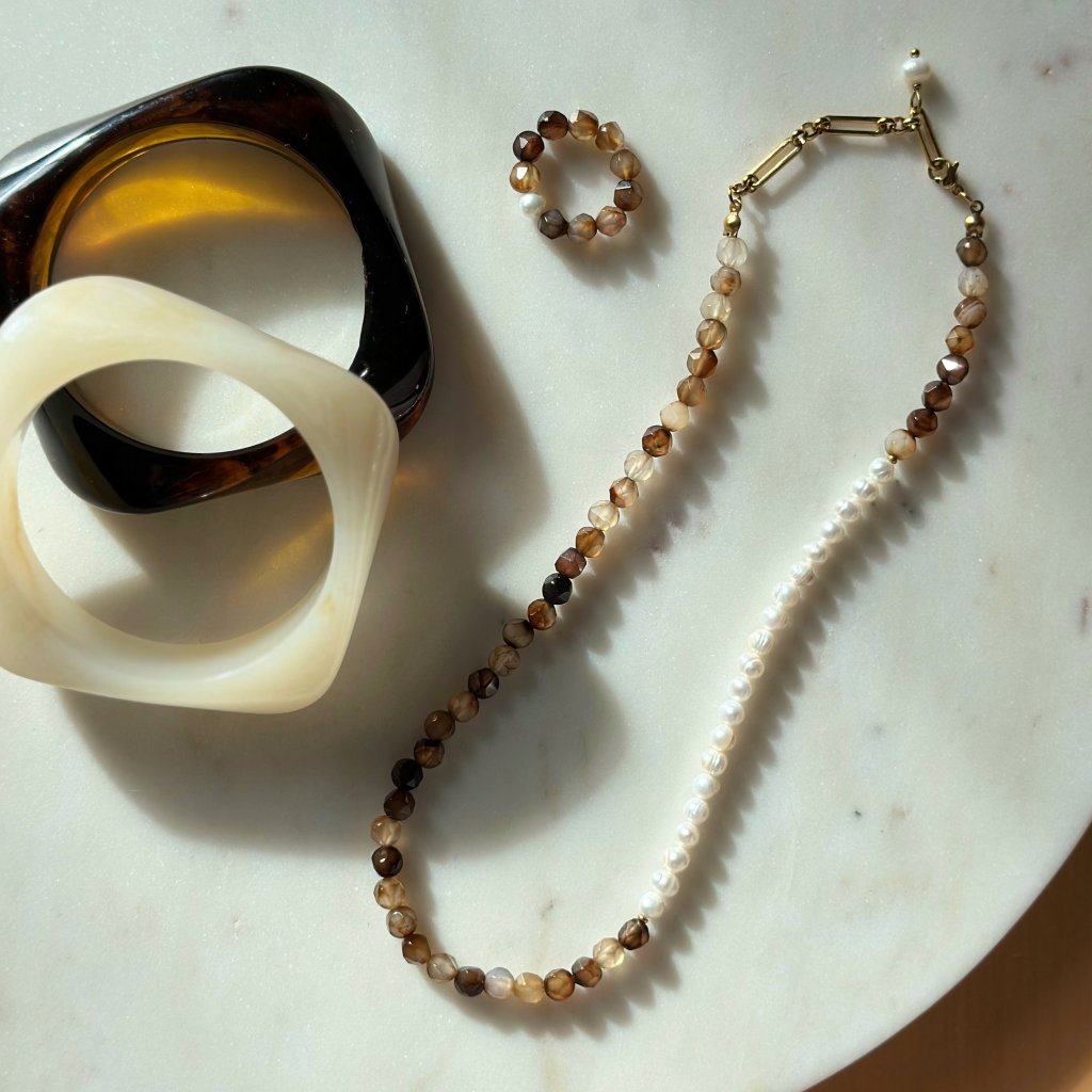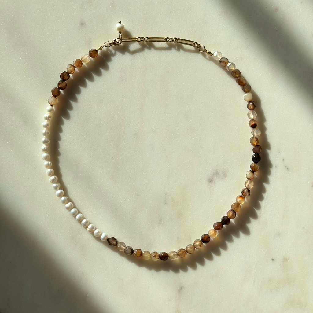 Elegantní choker z jemně tónovaného přírodního hnědého achátu (5–6 mm) a říčních perel (5 mm), navržený tak, aby přinášel dokonalou rovnováhu mezi přírodní krásou a sofistikovaným stylem. Choker je doplněn nápaditým nastavitelným řetízkem, který zaručuje pohodlné nošení a perfektní padnutí.