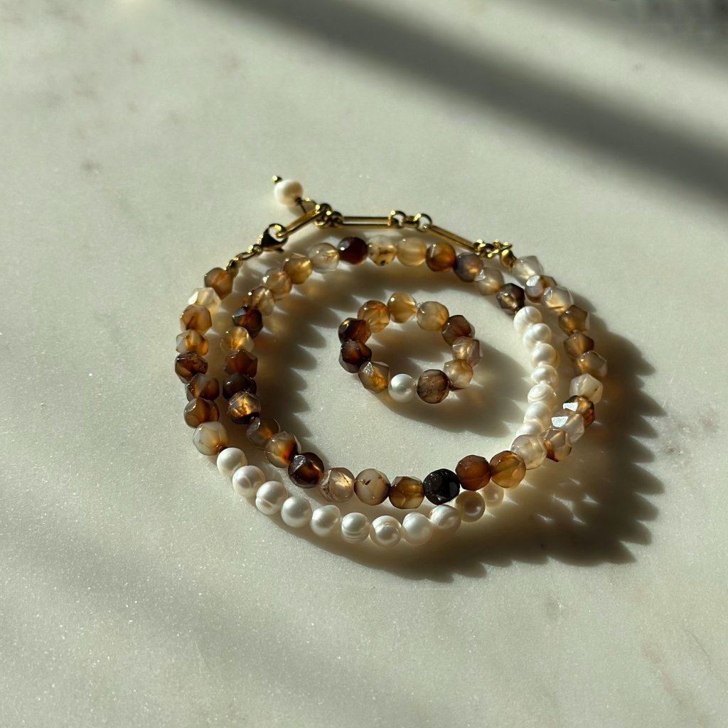 Šperk je dostupný ve zlatém i stříbrném provedení, což umožňuje sladění s osobním stylem a dalšími doplňky. Kombinace teplých odstínů achátu a jemného lesku perel vytváří nadčasový design, ideální pro denní nošení i slavnostní příležitosti.
