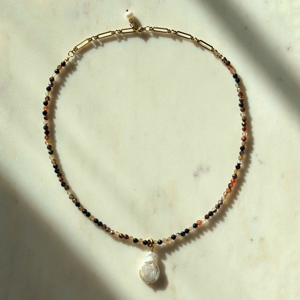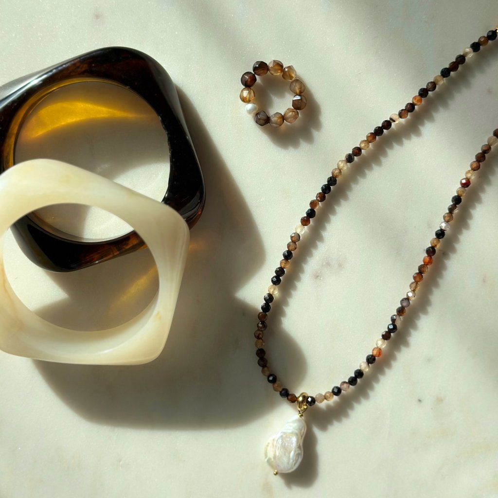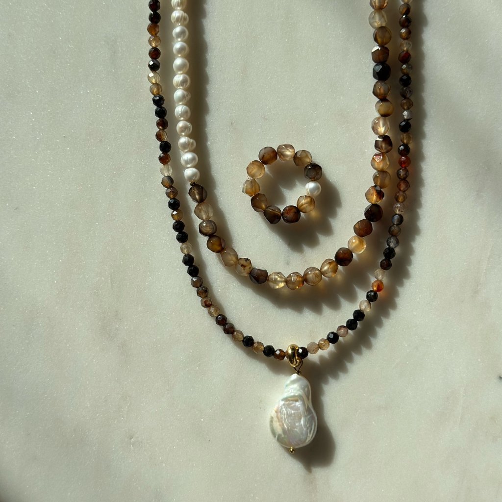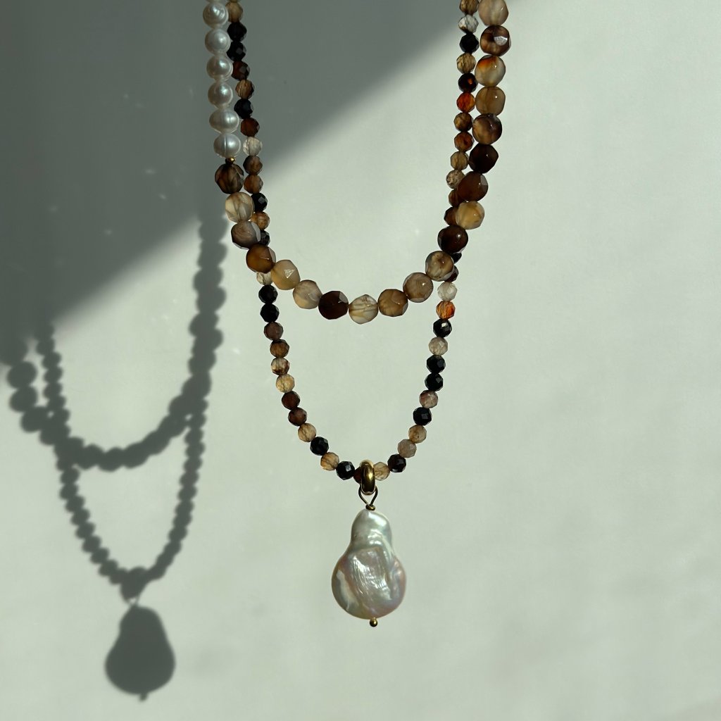 Každý korálek coffee achátu nese v sobě teplý odstín zemitě hnědé s jemným leskem, který ladí s přirozenou nepravidelností barokní perly. Výsledkem je šperk s charakterem – decentní, ale výrazný, jemný, ale nezaměnitelný.