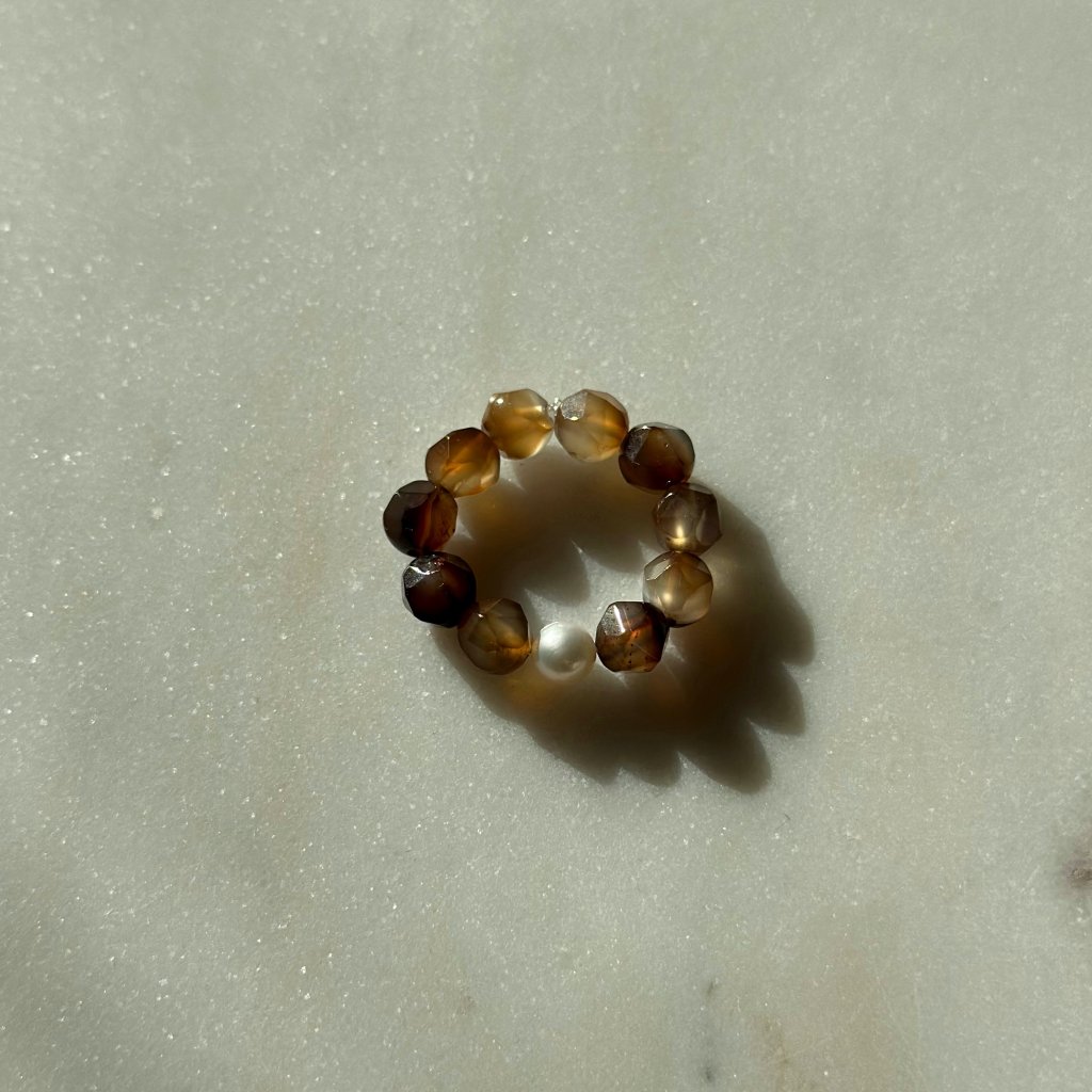 Prsten z fazetovaného přírodního coffee achátu (5–6 mm) doplněný o říční perlu (5 mm) v sobě spojuje zemitou sílu minerálu a něžný lesk perly. Každý kámen nese svůj jedinečný odstín hnědé s jemnými odlesky, které podtrhují přirozenou krásu perly.
