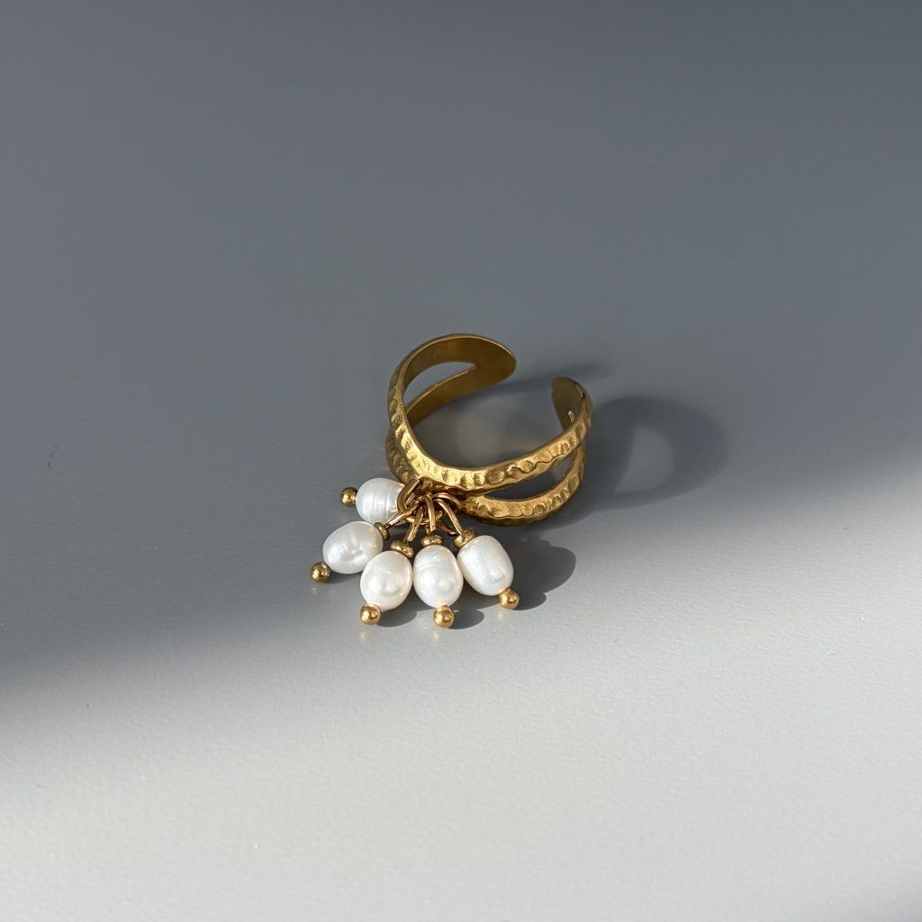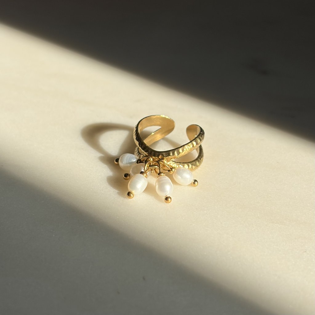 Prsten Fiori okouzlí na první pohled svou jemností a originálním detailem. Pět malých říčních perel vytváří něžný prvek připomínající rozkvetlý květ a při pohybu ruky se elegantně pohupuje.