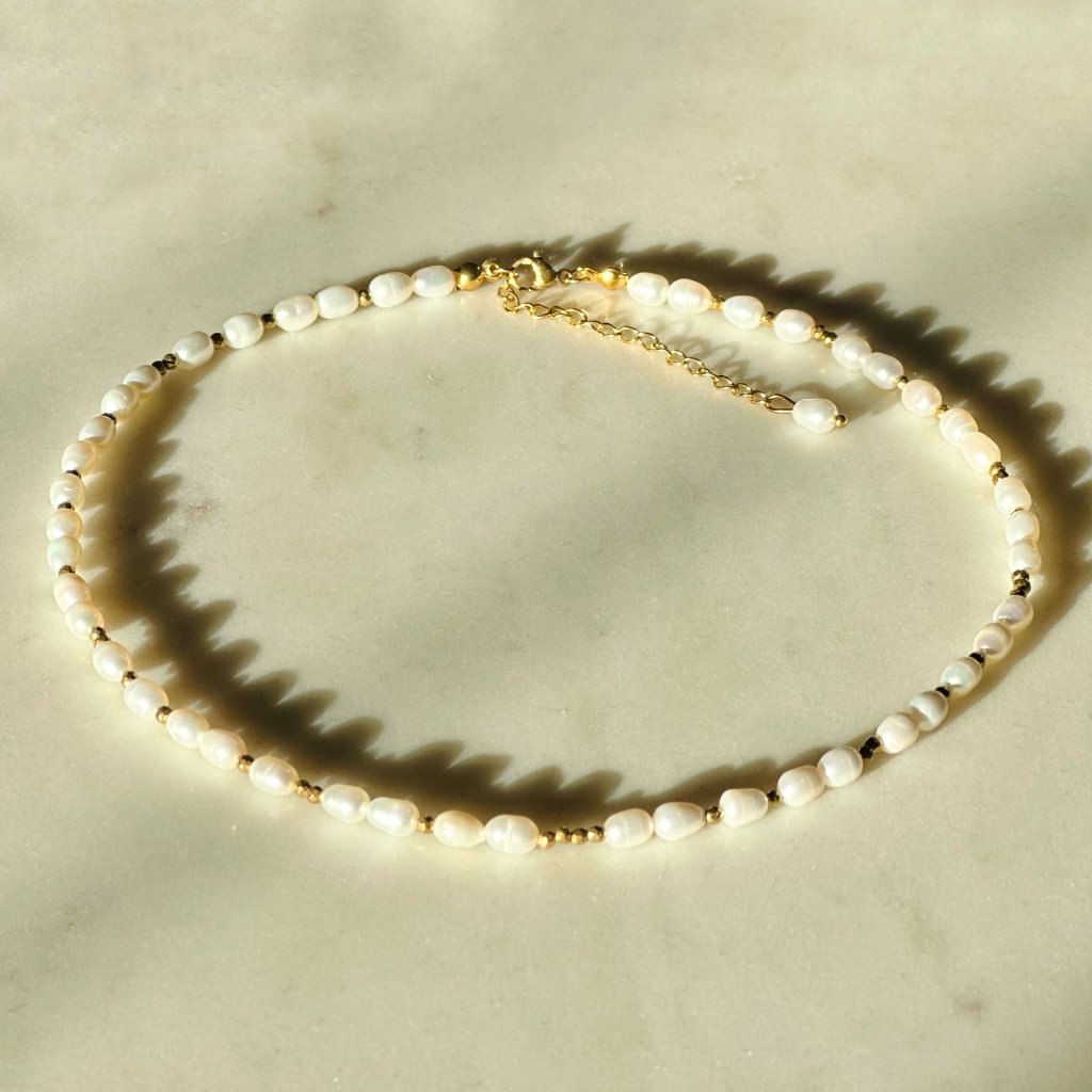 Náhrdelník z říčních perel tvaru rýže proložený korálky fazetovaného hematitu ve zlatém nebo stříbrném provedení.