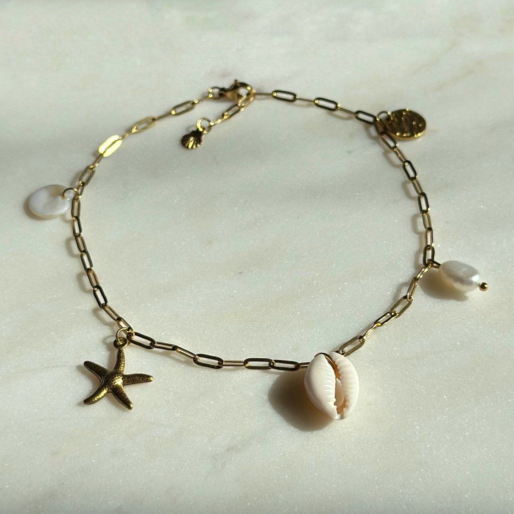 Elegantní náramek na nohu je dokonalým doplňkem pro léto. Spojuje jemný zlatý paper clip řetízek s hravými přívěsky inspirovanými mořem – zlatou hvězdicí, mušlí kauri, perlami a lesklými medailonky z perleti a kovu. Každý detail navozuje atmosféru slunečných pláží a mořského vánku.