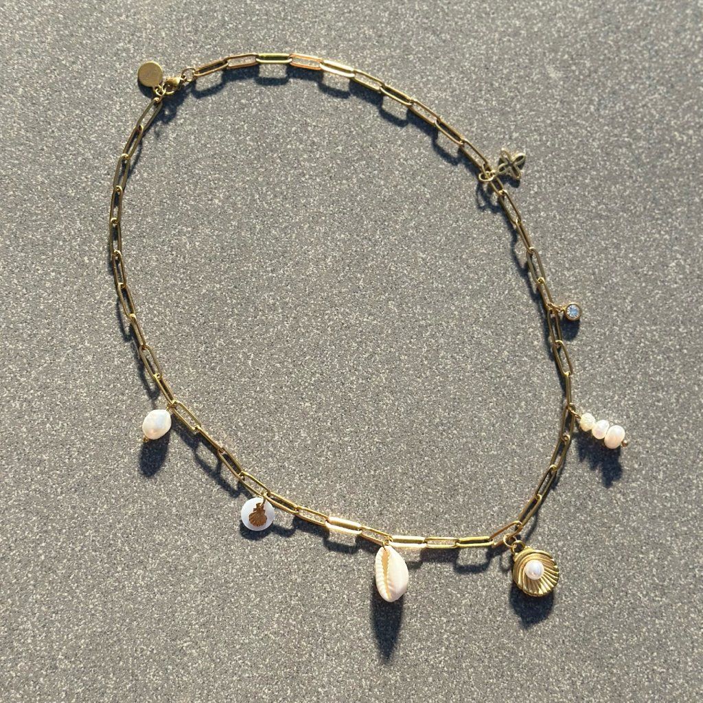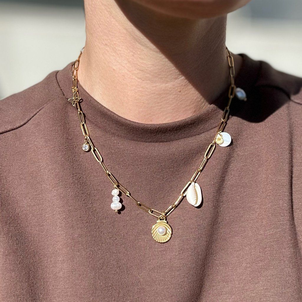 Letní náhrdelník Isla. Jemný, ale výrazný design doplňují přívěsky inspirované létem – mušličky, sladkovodní perly, perleťové detaily, třpytivé bohemian zirkony a symbol čtyřlístku pro štěstí. Perfektní k letním šatům i pro doladění boho stylu po celý rok.