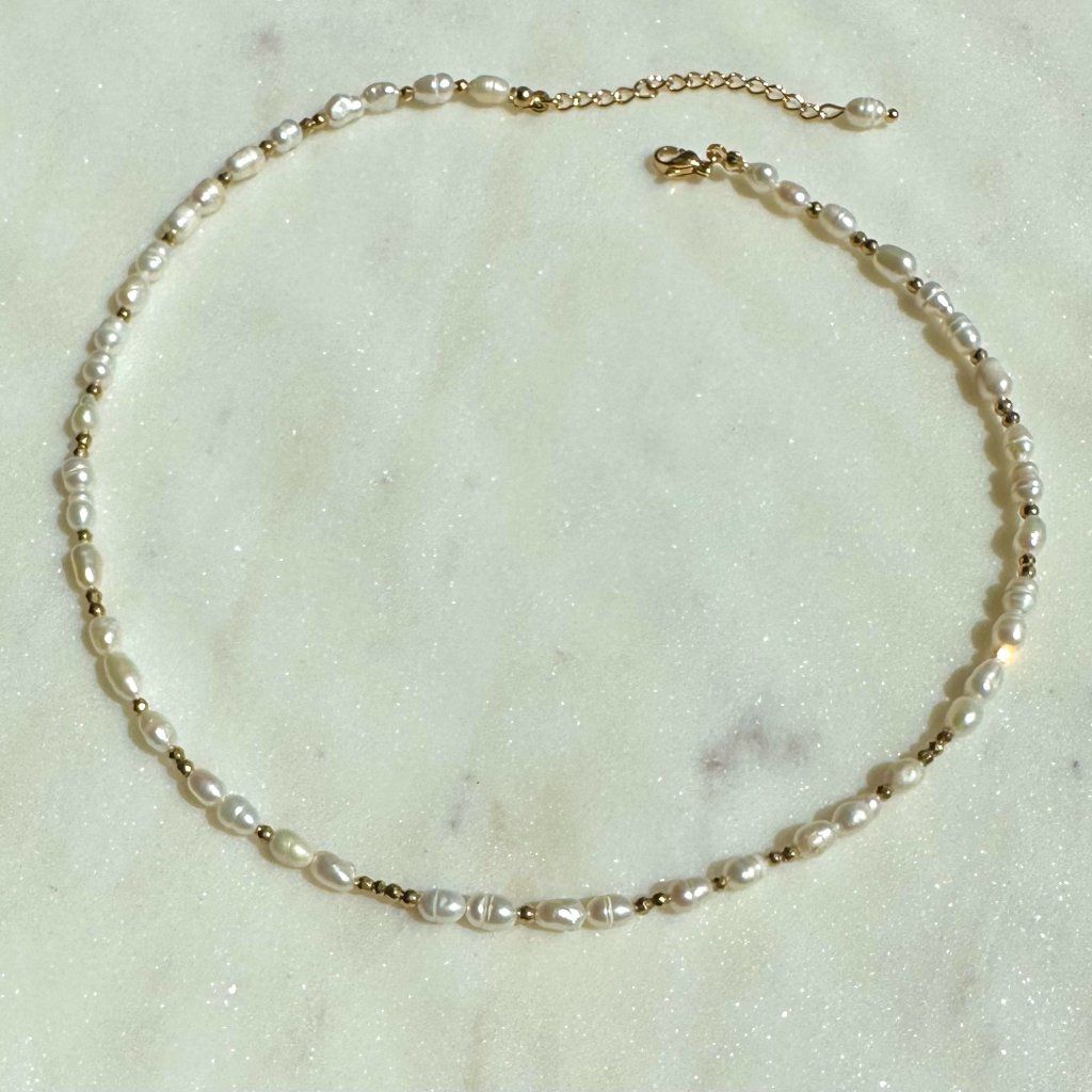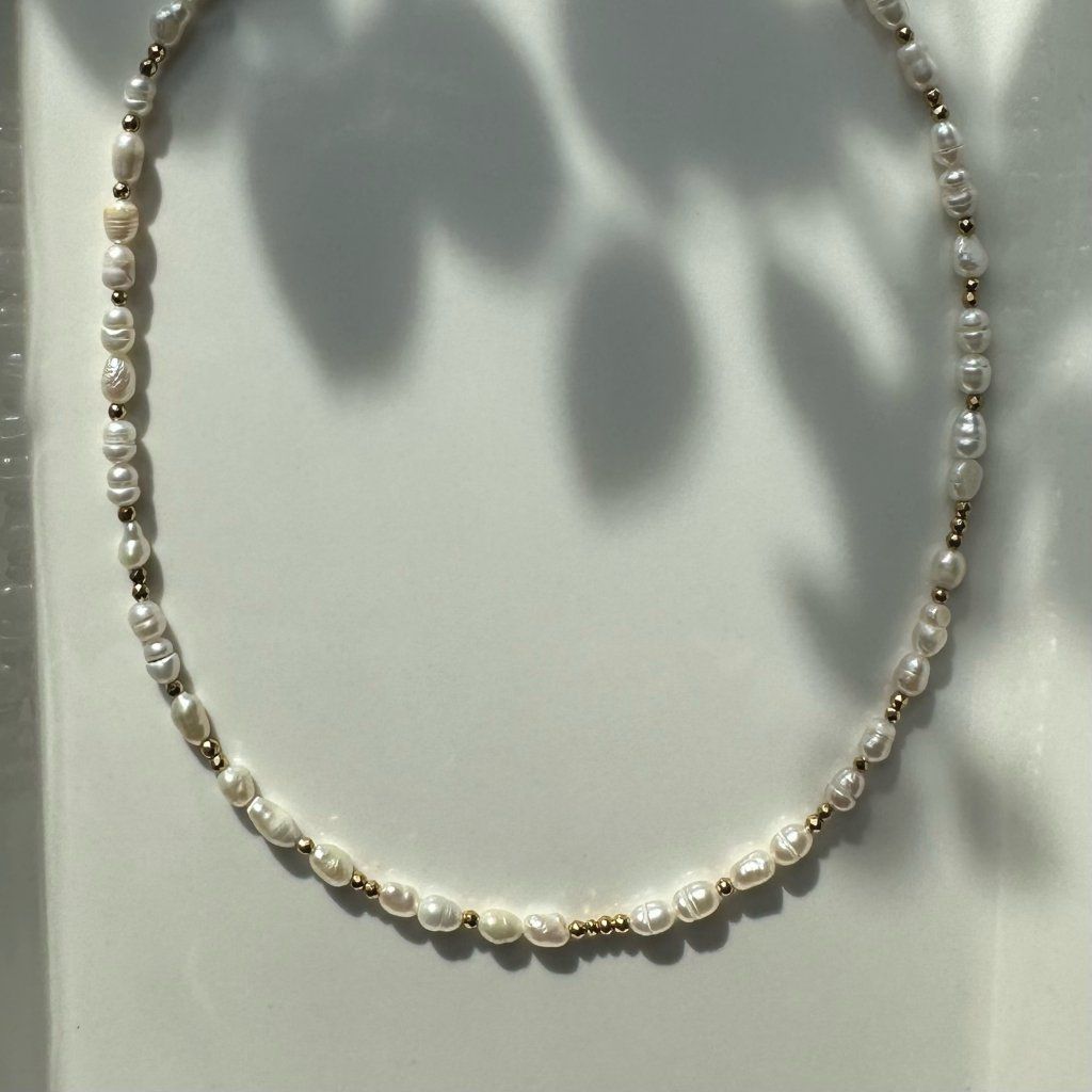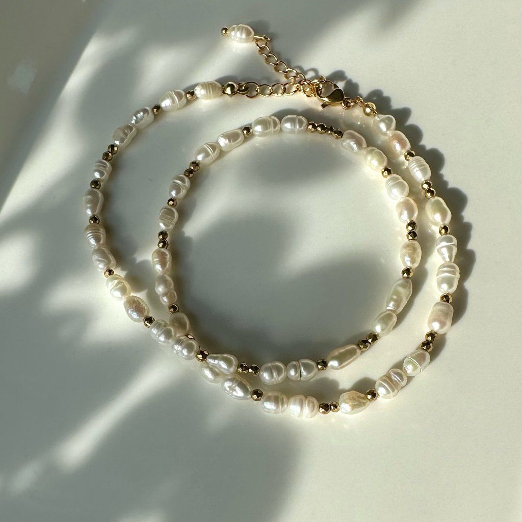 Náhrdelník z říčních perel tvaru rýže proložený korálky fazetovaného hematitu ve zlatém nebo stříbrném provedení.