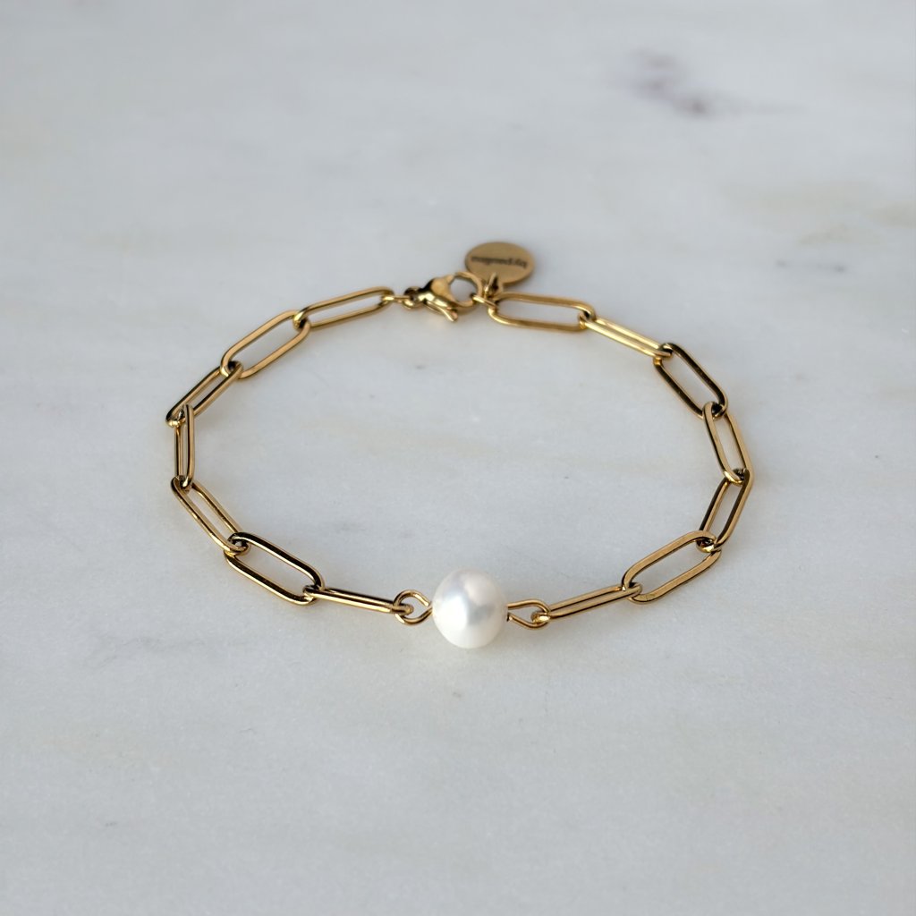 Jemný a elegantní náramek s bílou, růžovou nebo černou perlou na paper clip řetízku.