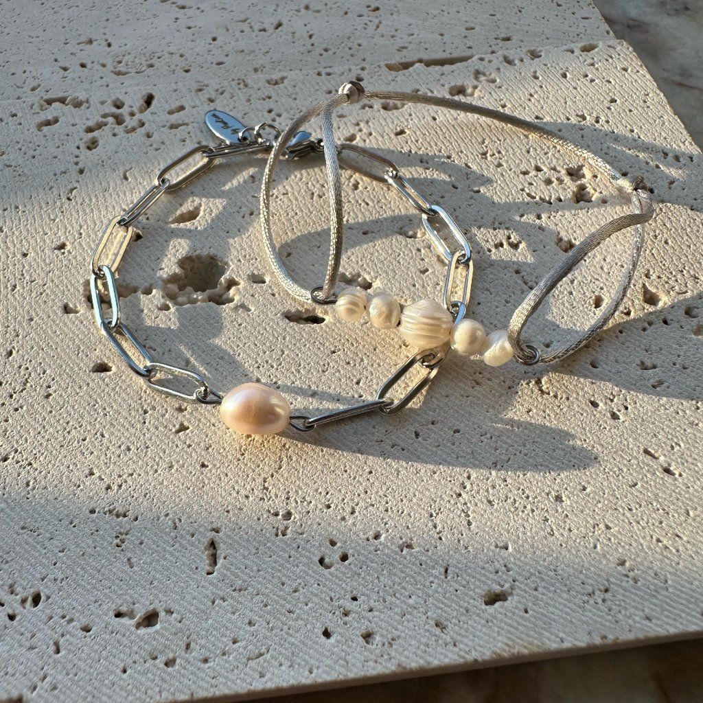 Jemný a elegantní náramek s bílou, růžovou nebo černou perlou na paper clip řetízku.
