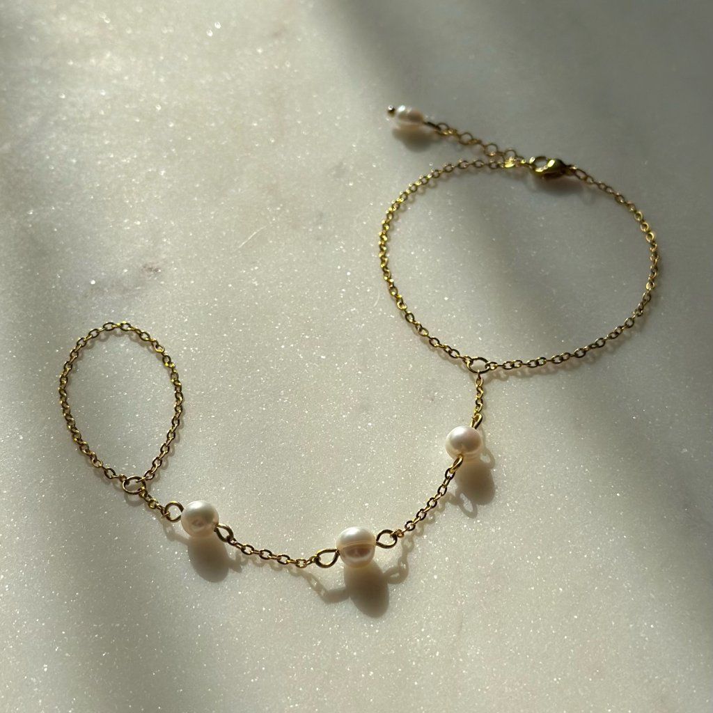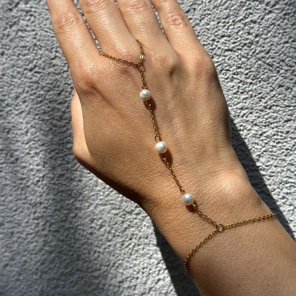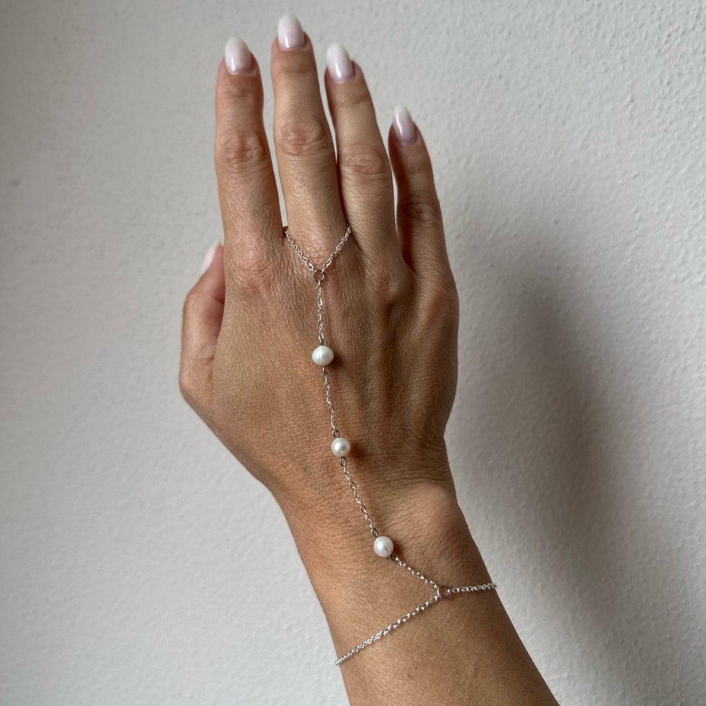 Dopřejte své ruce nádech elegance s tímto jemným šperkem, který propojuje náramek a prsten v harmonický celek. Ručně zhotovený hand chain ve zlatém nebo stříbrném provedení je zdobený třemi pravými říčními perlami, které dodávají šperku přirozený lesk a ženský půvab.