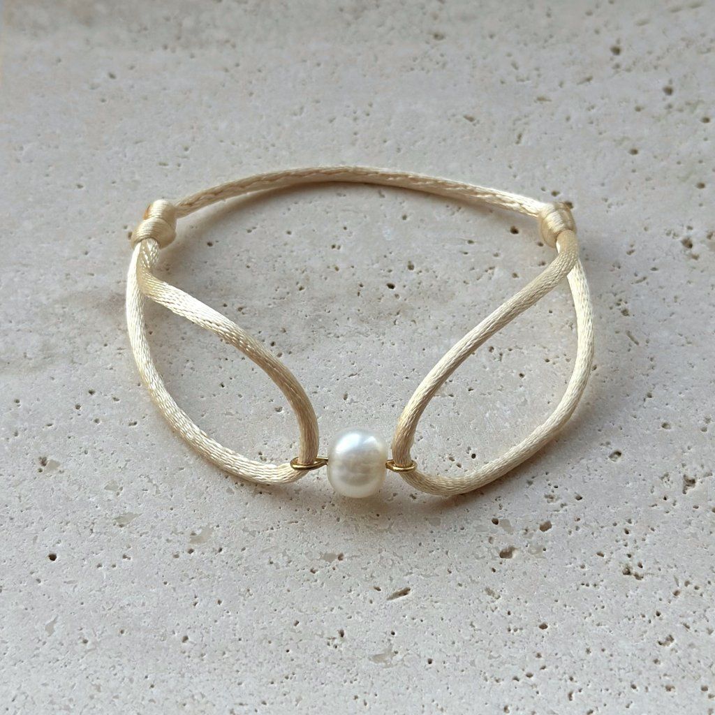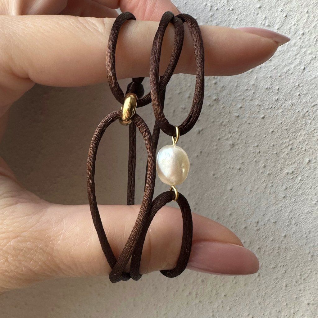 Minimalistický, ale nepřehlédnutelný náramek Zia na saténové šňůrce s přírodní sladkovodní perličkou. Ideální pro vrstvení i jako samostatný kousek.