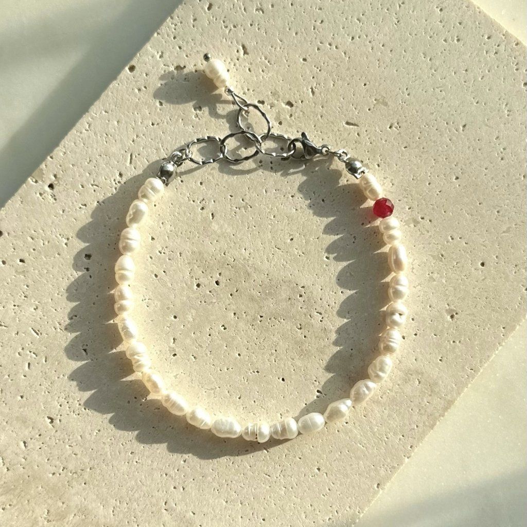 Jemný a nadčasový náramek z pravých říčních perel je doplněn detailem rubínu, který mu dodává jedinečný šarm a luxusní nádech. Perly symbolizují čistotu a eleganci, zatímco rubín vnáší do šperku vášeň a energii.