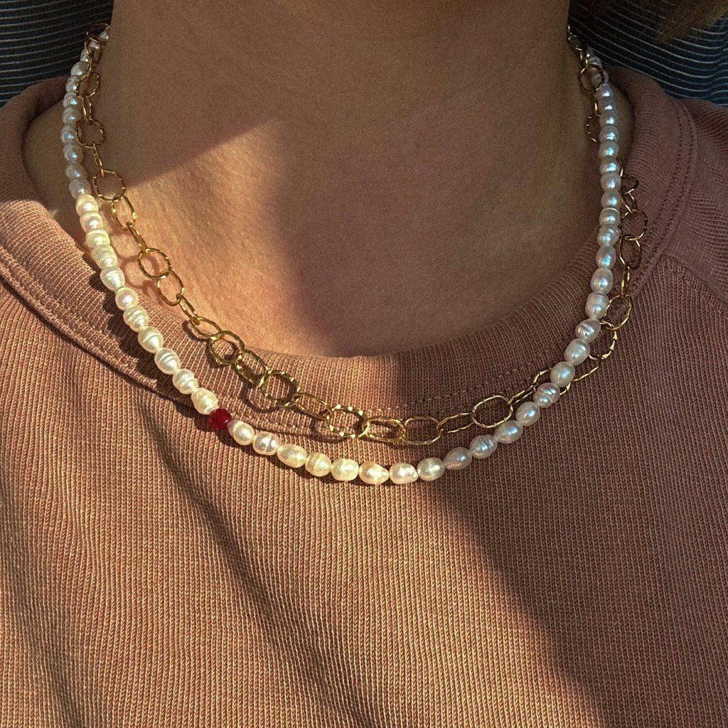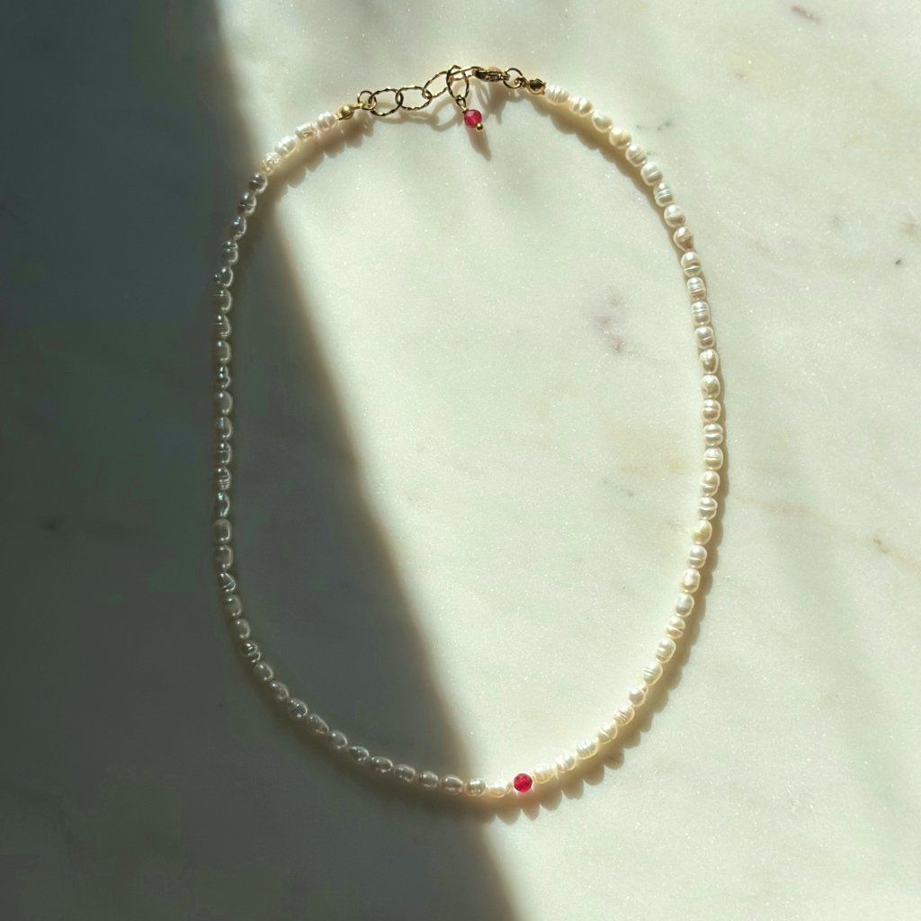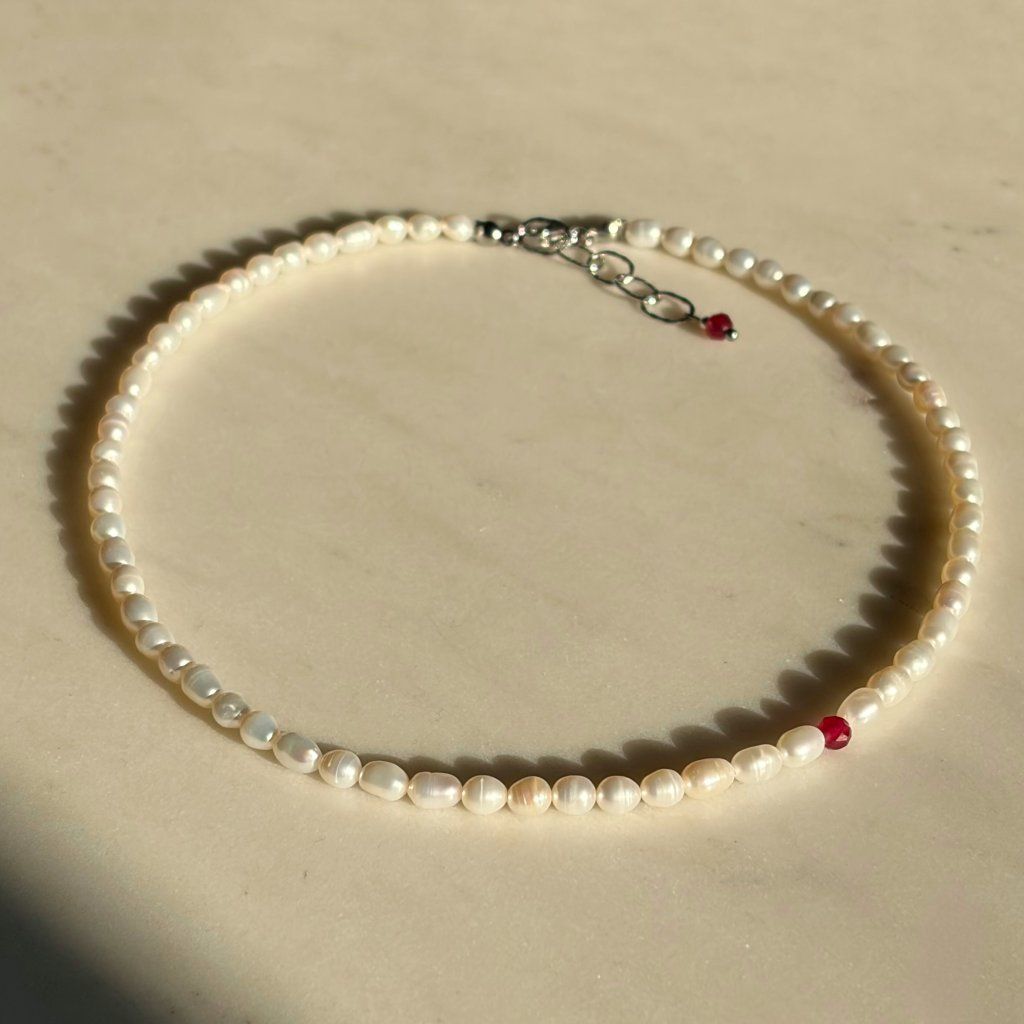 Klasická elegance v moderním pojetí – náhrdelník z pravých říčních perel doplněný zářivým rubínem působí sofistikovaně a luxusně. Perly podtrhují jemnost a ženskost, zatímco rubín dodává šperku jedinečný kontrast a energii.