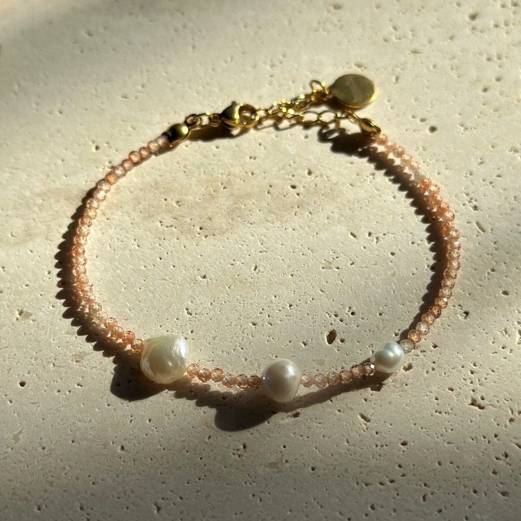 Náramek z jemných korálků slunečního kamene s detaily barokních perel.