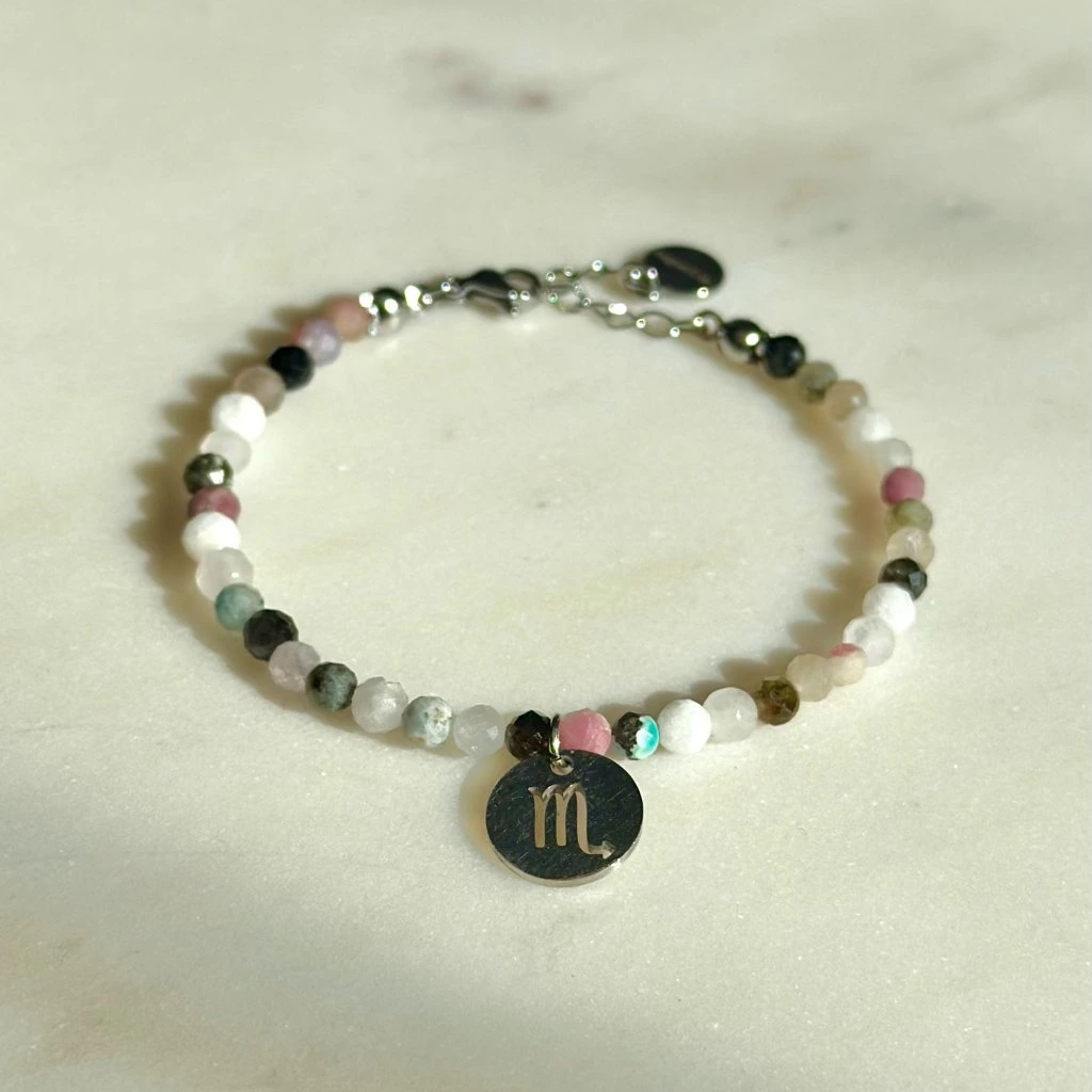 Náramek z polodrahokamů v duhovém efektu s medailonkem znamení zvěrokruhu.